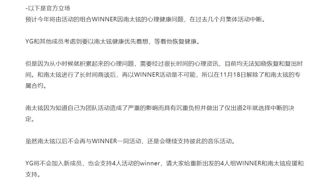 但是这都不重要,反正2016年11月25日,YG宣布了两个消息,一个是朴春不续约,一个是南太铉离开,当时给出的理由是南太铉多年的心理疾病。