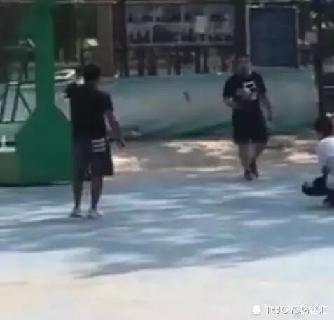 白色t恤黑色裤子,可是看过去画风好像不对呀!不是说好是帅气的打篮球吗?怎么是在捂着肚子笑呢,再一看,哦!原来是被胖虎给逗笑的!不过大哥的这个姿势这种笑,胖虎你究竟是做了什么让他笑成这样!好嫉妒你!不过那个站在篮球架下喝水的那个怎么看着有些像千玺宝宝呢!(是小编我自己觉着像哈)