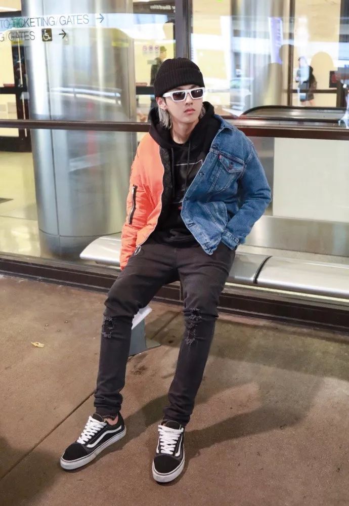 度假搭配也可以像吴亦凡穿的个性一点,张扬的拼接款牛仔上衣凸显男生桀骜不驯的个性,内里搭配帽衫,脚踩帆布鞋,看起来路人甲的搭配却总能让人记住你的样子。