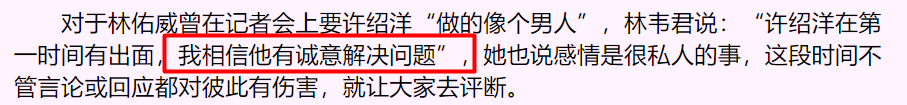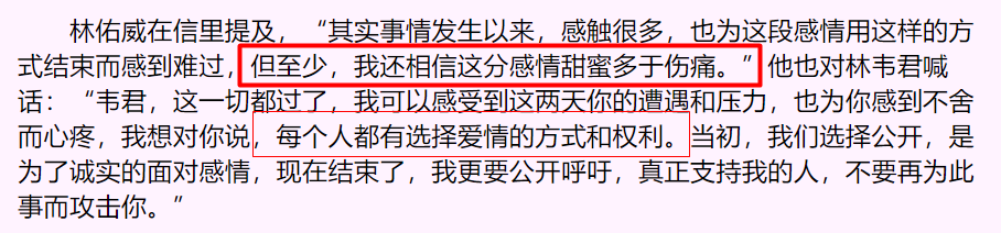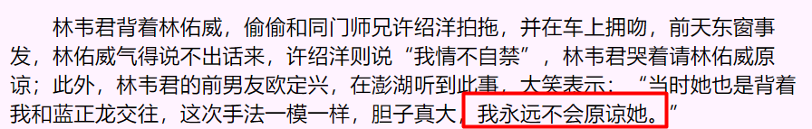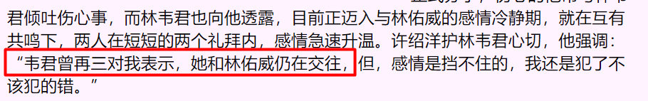 “韦君曾再三对我表示,自己和林佑威仍在交往。但我还是犯了不该犯的错。”