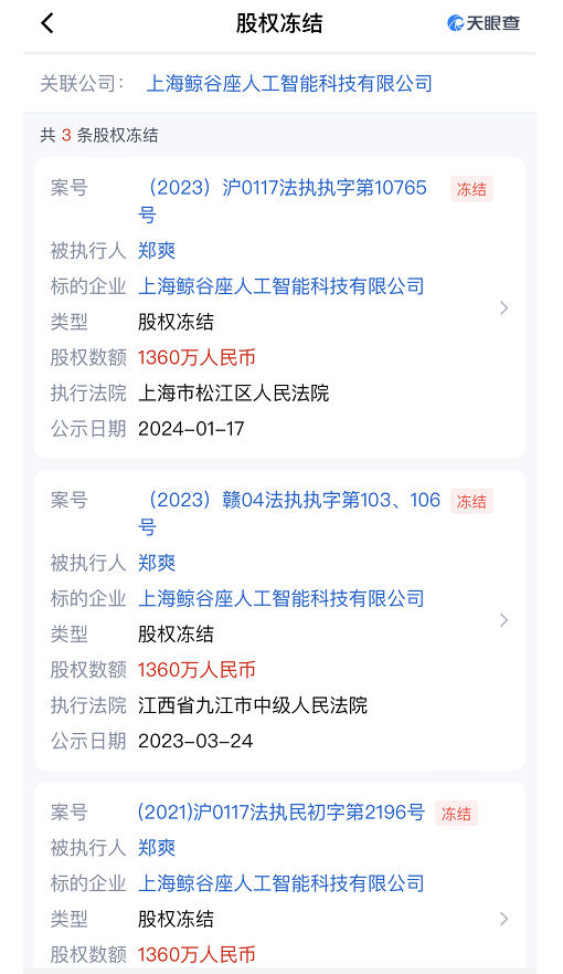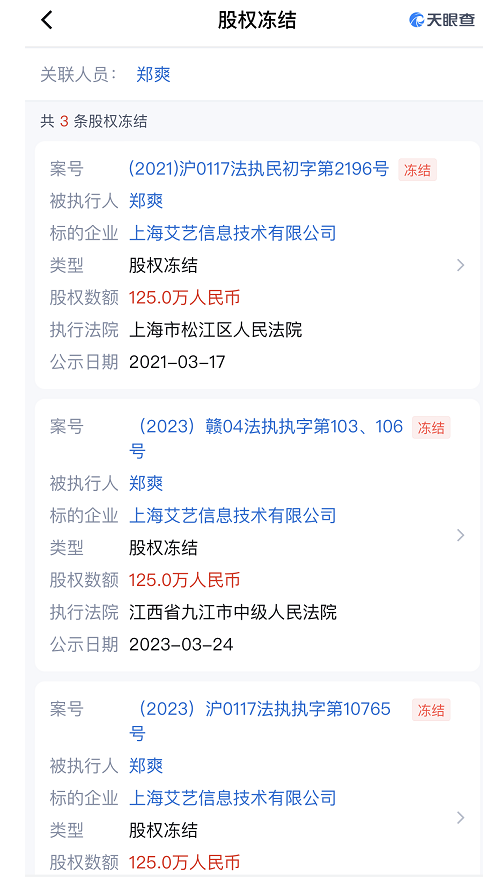 郑爽又出事,彻底完了 首席财经观察 内地女星 2024-01-19 19:33:23 327 创作不易,用心坚持,欢迎请BaGua喝几杯爱心咖啡!打赏并支持本文 打赏并删除本文 作者 | 周松涛来源 | 首席财经观察郑爽又上热搜了。天眼查App显示,近日,郑爽新增两则股权冻结信息,股权被执行企业分别为上海鲸谷座人工智能科技有限公司、上海艾艺信息技术有限公司,冻结股权数额分别为1360万元、125万元,冻结期限自2024年1月16日至2027年1月15日,执行法院均为上海市松江区人民法院。郑爽分别持有上述两公司68%、20%股份,认缴出资额为1360万元、125万元,值得一提的是,上海鲸谷座人工智能科技有限公司另一位股东为郑爽前夫张恒。郑爽除了这次股权被冻结之外,前不久,郑爽还被强制执行9050万元。天眼查显示,郑爽12月7日新增一则被执行人信息,执行标的9050万元,涉及海宁东开之星影视投资有限公司与其服务合同纠纷案件,执行法院为上海市松江区人民法院。据了解,2016年1月13日,海宁东开之星影视投资有限公司作为甲方,与乙方上海郑爽影视文化工作室签订《策划服务合同书》,甲方分期支付乙方策划服务费总计3050万元。同时,甲方邀请乙方艺人郑爽参与某影视剧的拍摄,出演第一号女主角。然而,涉案电视剧制作拍摄完毕,还未申请发行许可时,郑爽却已被“封杀”。海宁东开之星影视投资有限公司随后将郑爽告上法庭,且认为,乙方艺人参与违法犯罪活动或因劣迹,从而遭受封杀影响本剧至拍摄和上映的,甲方有权解除本合同,乙方应退还甲方已支付的酬金并赔偿甲方遭受的截止当时而遭受的实际经济损失。2021年12月16日,松江法院作出一审判决:要求郑爽返还服务费3050万元并赔偿经济损失6000万元,后郑爽提出上诉,二审维持原判。不过,郑爽并未履行这次执行。上海市松江区人民法院依法向郑爽送达公告,因未履行民事判决确定的义务,海宁东开之星影视投资有限公司已向法院申请执行。现送达执行通知书、报告财产令,以后执行中作出的法律文书等,情况没有变化的,不再另行公告送达。此前,郑爽因为阴阳合同被罚款2.99亿,此后成为劣迹艺人,淡出影视圈。郑爽,1991年8月出生于辽宁省沈阳市,毕业于北京电影学院,中国内地影视女演员。2009年,郑爽因主演青春剧《一起来看流星雨》大火。不过,现在的郑爽已经麻烦不断,多次被强制执行,还拒绝执行,成为老赖,已经彻底凉了。点击关注,跟主编交个朋友 版权及商务合作请加QQ / 微信:2881339630点右下角在看,可以优先收到我的文章↓ 创作不易,用心坚持,欢迎请BaGua喝几杯爱心咖啡!打赏并支持本文 打赏并删除本文 感谢您的支持鼓励,我会继续努力的!文章地址:用户邮箱:打赏金额:USDT 请输入数字点击”去打赏“,即可进行打赏支持本文章哦 郑爽 发表评论