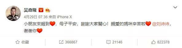 昨天一大早,吴奇隆就发文宣布妻子产子喜讯:小朋友来报道到,母子平安,谢谢大家关心!亲爱的妈咪辛苦啦,谢谢你!