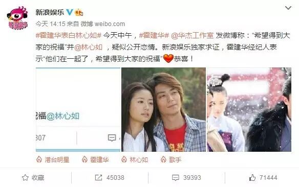 林心如工作室也在第一时间承认了两人已经在一起,并称希望得到大家的祝福。