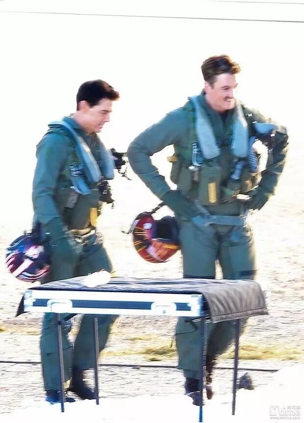 只见两人双双穿着飞行服,腰间挂着安全帽。两人不知在聊什么,笑得合不拢嘴。1米83 的迈尔斯比1米7的阿汤哥高出不少。