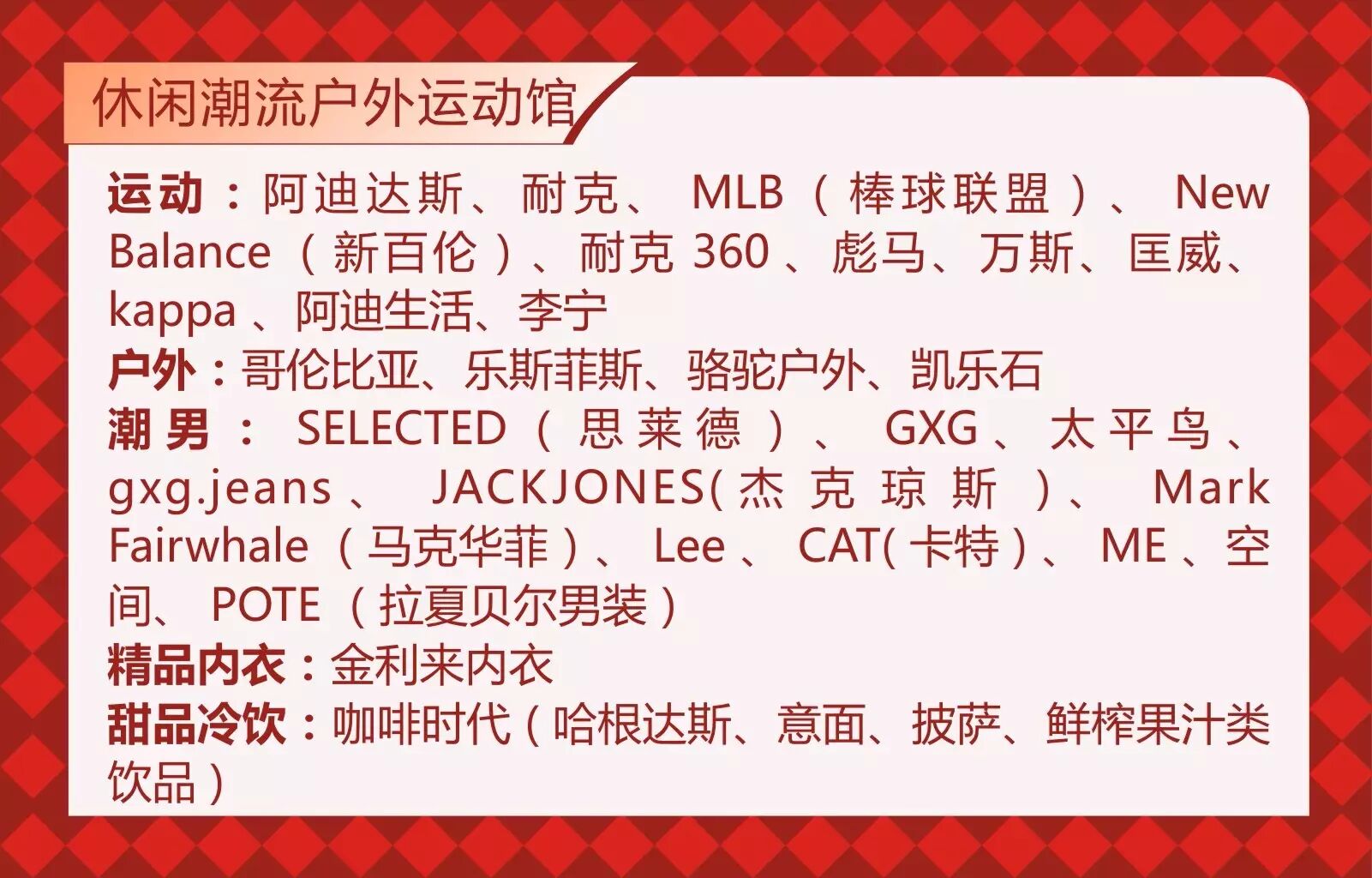 石城年轻人潮流聚集地、石城潮人约会购物休闲首选!在时代广场5楼男女运动休闲装及时尚男装潮流品牌旗舰店,每一个角落都渗透着最鲜活的个性时尚和浓浓的国际范,不断为石城消费者带来创新性的购物体验。。