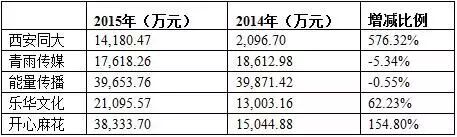 净利润方面,2015年西安同大、青雨传媒、能量传播、乐华文化、开心麻花公司均没有亏损,其中开心麻花公司净利润高达1.31亿元,同比增234.15%,主要由于其首部电影《夏洛特的烦恼》取得较好投资收益。与2014年相比,西安同大净利润暴增3,071.04%;青雨传媒增幅最低,仅有14.12%。作为轻资产的影视公司,这5家企业2015净利润与上年同期均出现增长态势。