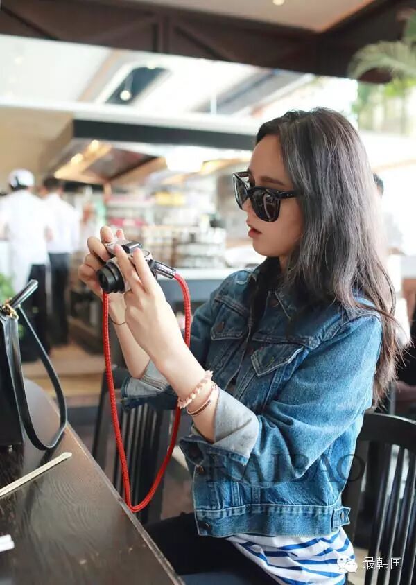 韩佳人穿条纹内搭配牛仔服,小帅气中又不失俏皮可爱!