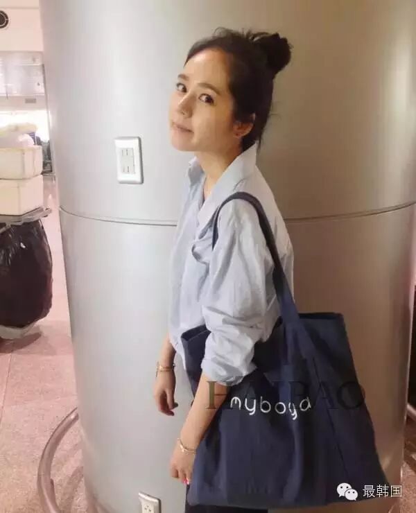 韩佳人穿蓝色衬衣配深色长裤,背蓝色帆布包,梳起丸子头,十分清爽!