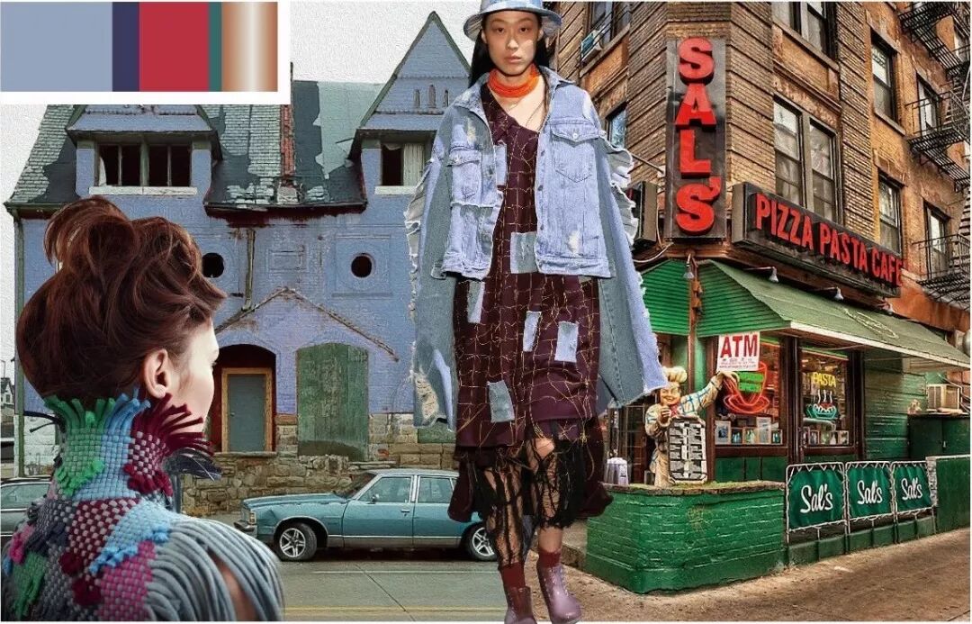 浅蓝灰搭配暗紫红,加上一点点的金属色和古旧的绿,让造型有了时代的意义。