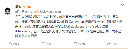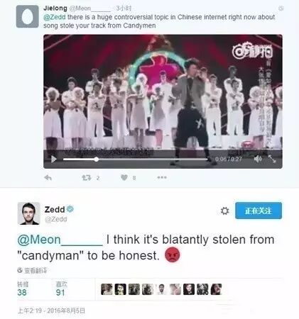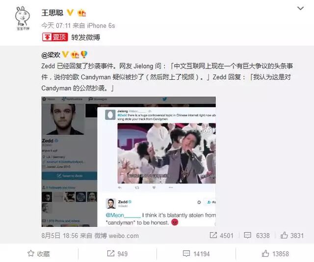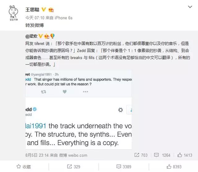 王思聪就这件事情今日连转三条微博直指大张伟抄袭不承认,除了转发大张伟回应歌曲涉抄袭的微博外,他还连转两条音乐人梁欢的微博,梁欢在微博中晒出网友就此事求证当事人Zedd的对话,称Zedd本人已表示大张伟在抄袭。
