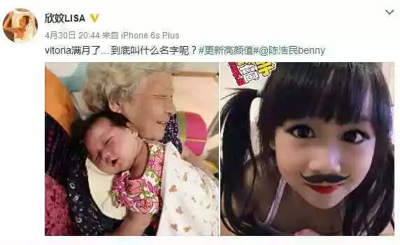 4月30日晚,陈浩民妻子蒋丽莎在微博晒出第四胎女儿满月的近照,还附赠了一张大女儿的卖萌照,网友纷纷表示被大女儿萌了一脸。