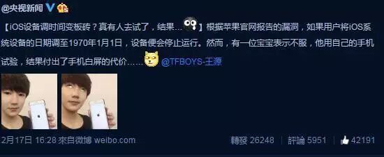 前不久有条新闻是这样的:“IOS设备调时间变板砖?真有人去试了,结果…”文字里面的“有人”,“这位宝宝”指的全是一个人,就是TFBOYS的王源!人家可是拥有1402万粉丝的小小鲜肉,编辑,你到底认不认识人家嘛?王俊凯,易烊千玺你肯定也不认识了吧!