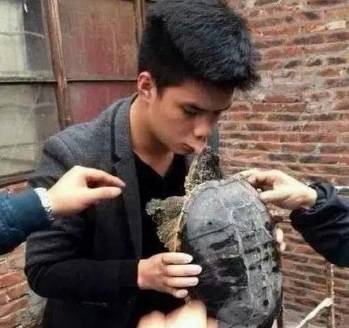 你见过人给乌龟亲嘴的吗?一哥们无意间捉到一个千年龟,托朋友拍照留念,甚至还玩亲亲。