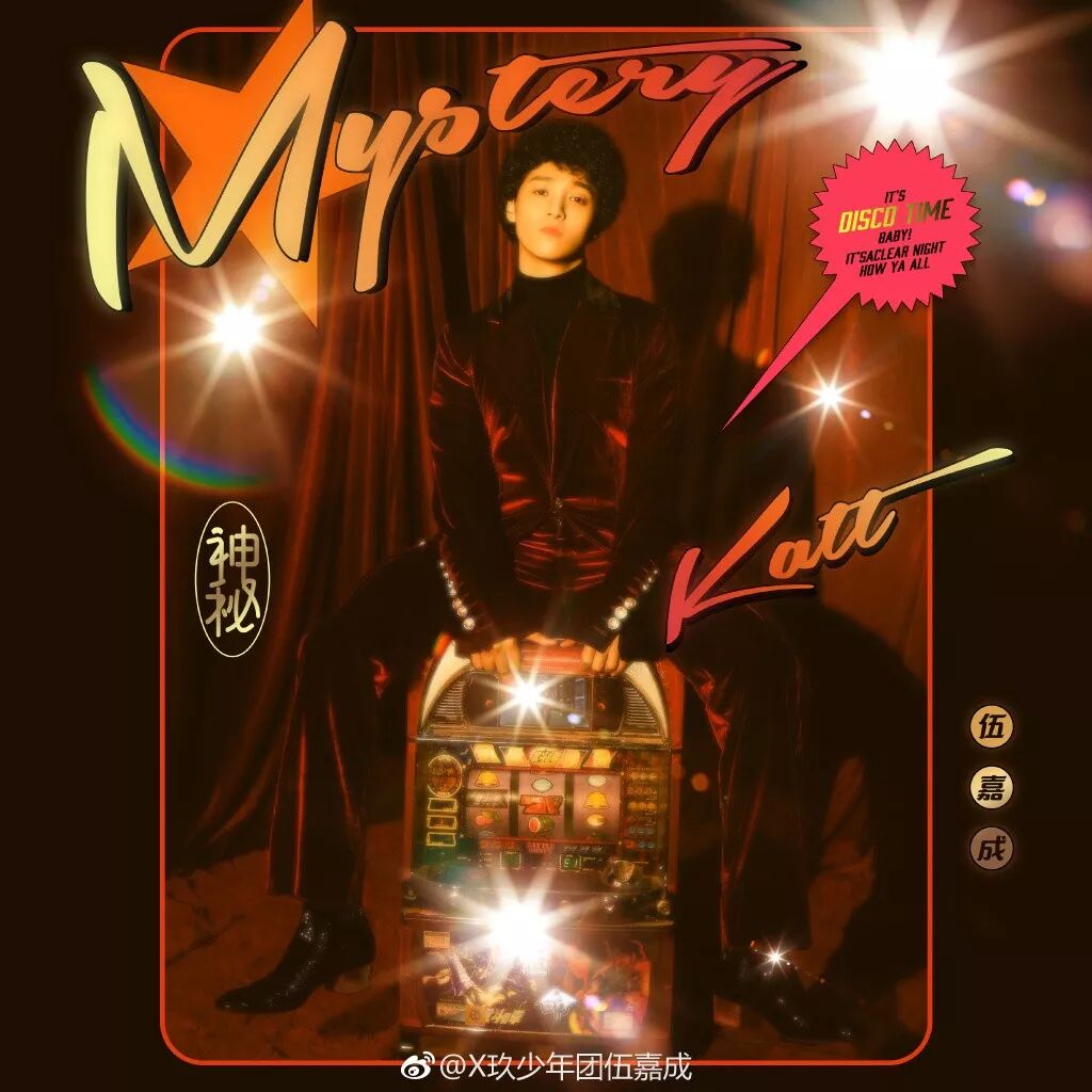 顶着爆炸头,身穿绒面紫色西装,内搭高领黑色毛衣。身后是八十年代俱乐部模样的舞台,身前是可以随意挥洒的麦克风架,伍嘉成就这样带着专辑中的首波主打歌《神秘》,踩着摩登步点朝我们走来。