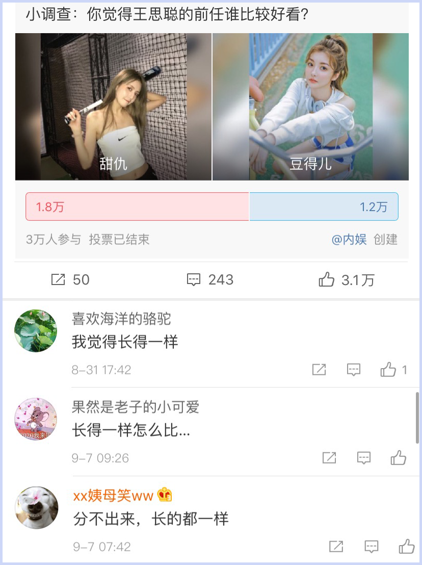 王思聪连人妻都不放过?!太狠了... 买买能买 内地男星 2020-10-15 14:07:21 676 创作不易,用心坚持,欢迎请BaGua喝几杯爱心咖啡!打赏并支持本文 打赏并删除本文 大家好,我是吃瓜女孩·徐买买这几天王思聪又开始骚动了,带着几个美女逛街,还穿了件死亡芭比粉毛衣,认真的吗?我的卡姿兰大眼不会瞎吧校长在美女中真是来去自如啊!难道他忘了自己国庆的时候,才刚撩了一个美女?之前校长点赞美女的微博,八成都公开恋情了,这次不少网友也起哄说她是下一任女友!!眼尖的我还发现,他2年前就夸过这位大美人,估计那时候他已经心痒痒了买买也不吊大家胃口了,这位美女就是网红夏诗文她之前的鞠婧祎仿妆就美到出圈~感谢王校长,让我挖到一个宝藏美人而且素颜还神似郭碧婷!!这是什么神仙小姐姐啊,我一个直女快要粉上她了话说现在的网红多少会在脸上微调吧?没想到咱们诗文还是个纯天然美女,从小就是美人胚子,OK,王思聪的眼光我服了难怪网友都称她“网红界颜值天花板”,直播生图都惊艳众人,也是没sei了诶等等,直播间旁边坐的这个男人……好像是她老公?!!原来夏诗文已经是人妻了!还是跟青梅竹马+初恋男友结婚的那种王校长可千万别冲动对人妻下手啊,哪天被路人拍到你们一起逛街,热搜第一可就下不来啦!话说校长虽然女友换的快,但审美一直是很“专一”的更搞笑的是,网友们投票PK“王思聪的前任谁更好看”时,评论一堆人都说“分不清,长得都一样”这也不难理解,毕竟美女都有共性,而且她们贴上“王思聪前女友”的标签后,名气和热度好像也涨了8过,最后让大家记住的,好像就那么几个人耶(这样说会不会被打)今天买买就来扒一扒,被记住的这几个“王思聪的前女友”到底过得怎样了?是更好还是糊了?张予曦之前是一个模特,靠着天使面孔和苗条身材,还拿过《瑞丽》模特大赛的全国总冠军,镜头表现力杠杠的当时自爆“我是他女朋友”后,虽然跟王思聪只交往一个月,却收获前所未有的流量,从而由模特转变为女明星慢慢的,她接戏、录综艺的机会也越来越多,跟男明星也有合作(一时不知道该羡慕校长还是她...)前段时间大火的古装剧《琉璃》,她还饰演了古灵精怪的女二玲珑~这段哭戏能看出她演技还OK,这伤心落泪的样子我都开始揪心了还在《韫色过浓》中担任女主角,跟5月男友丁禹兮合作,上演女明星倒追男医生的戏,全程甜度爆表!张予曦也挺拼的,除了当演员,还兼顾淘宝店老板娘,连模特也是她本人除了演戏和管理淘宝,模特的本职工作也没落下,比之前接手了更多大牌杂志,比如《时尚芭莎》最近她的“在逃公主照”还上了热搜,不愧是模特出身,去cosplay应该能拿奖了!张予曦真的是王思聪前女友里面,娱乐圈资源最好的一位了,不仅接了更多大牌杂志拍摄,演戏的机会也越多越多了,简直羡煞旁人哇说起姚星彤大家可能不是很熟悉,她是一个比较低调的演员,之前演过《前任攻略》的女主角,不知道大噶有木有印象据说王思聪在她的电影发布会上,还送了999朵玫瑰花而且她还打破了王思聪“月抛女友”的习惯,俩人交往了一年多分手后的她又多了一个新标签,就是“龙女郎”!当龙女郎并没有嘴上说说那么简单,她可是踏踏实实的在成家班训练了好几个月,连成龙都说“她有当打女的潜质”成龙还跟她合作了几部电影,像票房上亿的《十二生肖》,就是她当选了女主角,还拍摄了不少跳崖、跳海的惊险镜头还有今年成龙的新电影《龙牌之谜》,她在里面的这段打戏,看得我心惊肉跳现在37岁的她,依旧是亲身肉搏,用实力证明自己长期锻炼打造的身材也很绝,马甲线、翘臀、大长腿一样不少,买买看完又有动力减肥了!!虽然她不像流量小花们一样出圈,但是她身上的那股劲儿,买买很佩服~这才是现实版“乘风破浪的姐姐”啊!姐你值得火!!网红王者雪梨,大家应该都听过吧?她可以说是王思聪前女友里最厉害的一个了,商业头脑无敌!她大三时,用3000块创建了淘宝店“钱夫人”,发展十分迅速跟王思聪的恋情曝光后她名气暴涨,连带着给店铺也做了一波宣传!现在已经粉丝上千万,销量破亿!衣服经常上新不到1分钟就被抢光了...据说对儿子私生活一向不操心的王健林,却特别欣赏雪梨,曾经把她当做准媳妇看待。事实证明,王总的眼光是真的牛,雪梨成立了电商公司宸帆,自己担任董事长兼CEO,旗下有150+红人,公司估值10亿!27岁就登上了福布斯精英榜,还被邀请到阿里全球投资人大会,全场飙英文的样子,简直帅炸!除了认真搞事业,她还是个学霸,考入马云开的“中国哈佛”湖畔大学,里面全是商业精英!再次论战了有钱又美的人比我还努力! 现在她已经结婚生子,30岁不到就事业家庭双丰收,实在是令人羡慕!你以为她身家上亿只会享受生活?不!她现在还一边带娃一边赚钱,果然成功的人从来不会停下脚步,我服了同样是开淘宝店的网红豆得儿,也是跟王思聪交往最久的一位,却被网友吐槽“混得最差的一届女友”。95年的她是北京舞蹈学院的学生,参加艺考时还被称作“北舞最美考生”跟半藏森林一样,属于最受直男喜欢的白幼瘦类型不少人还把她当初恋女神,加上王思聪的影响,在网上逐渐走红。不过人红是非多,因为还在读大学就和“国民老公”谈恋爱,被好多网友骂拜金,遭受了不少网络暴力。跟王思聪分手后,可能是失恋加上黑子一直在喷她,豆得儿逐渐开始放飞自我…直播截图