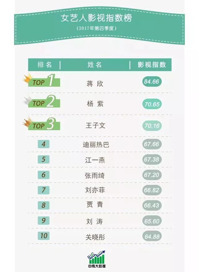 这周为大家带来的是女艺人的影视指数榜,排在前三的分别是蒋欣、杨紫、王子文,可是欢乐颂五美之三哦!