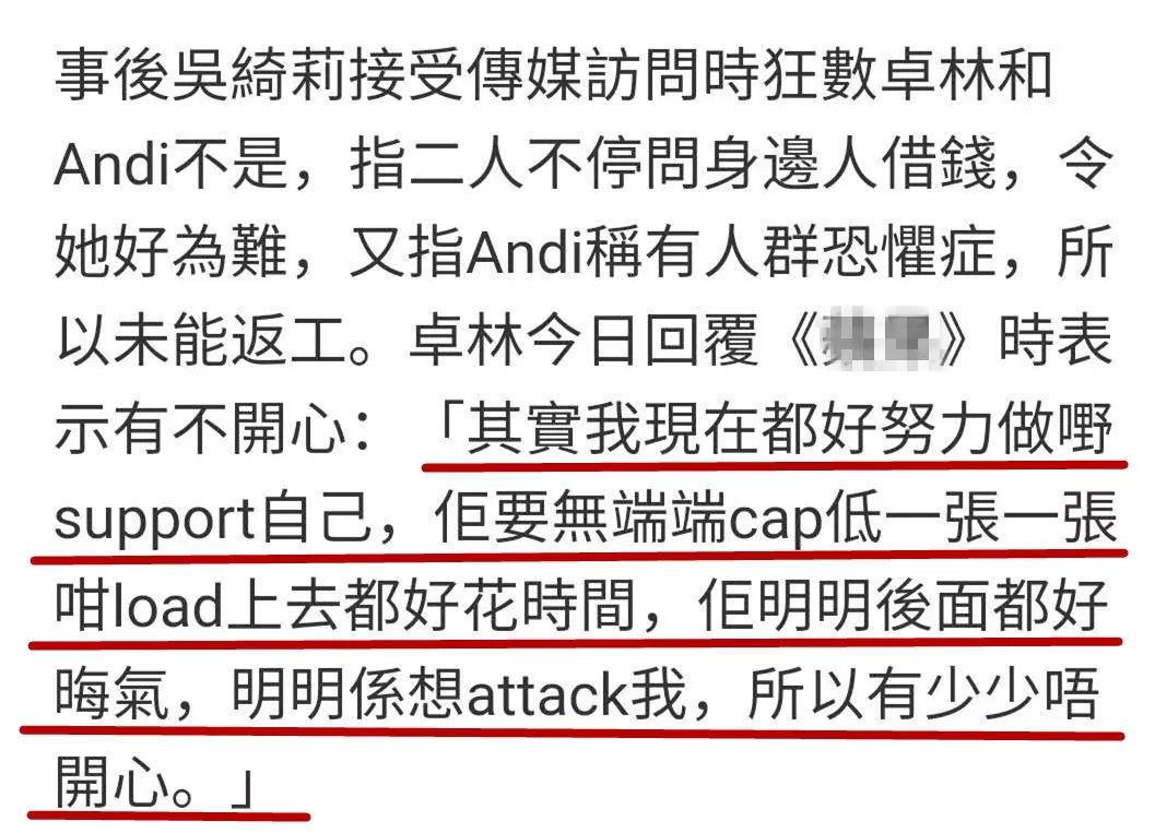 没想到当天晚上,吴卓林突然在网上宣布婚讯,签约计划直接泡汤。而吴卓林还继续和经纪人借钱,吴绮莉不希望女儿好吃懒做没有同意。因为没有借钱,吴卓林和Andi也不再理会经纪人。