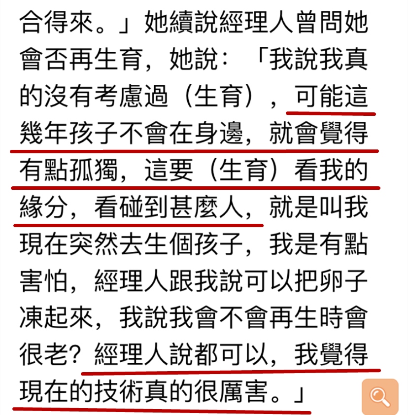 但从经纪人口中得知可以冻卵,而且告知她冻卵后再生也不受年纪限制,让她觉得现在的技术很厉害。