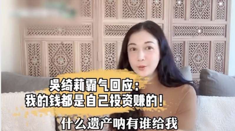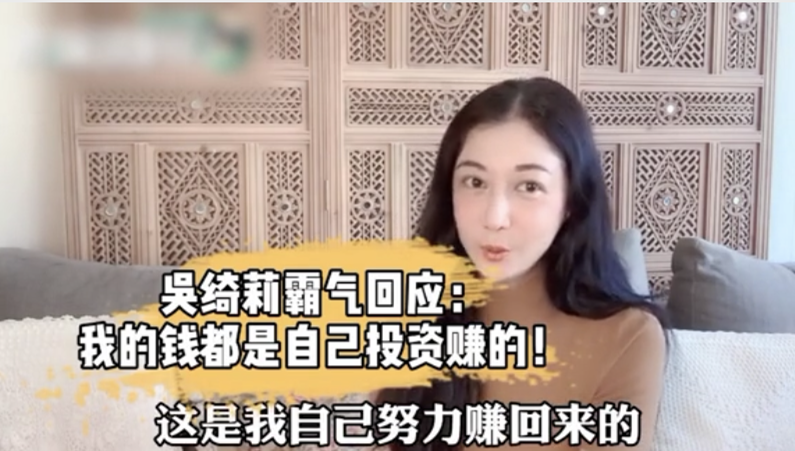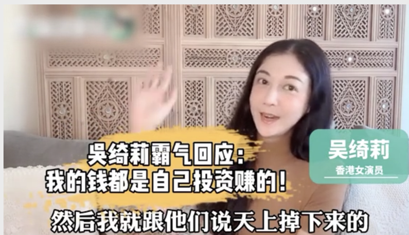 在另外一个视频里,吴绮莉谈及收入来源,她笑言很多朋友好奇她的钱从哪里来。她开玩笑说从天上掉下来,不过事实不是如此,这只是开玩笑而已。