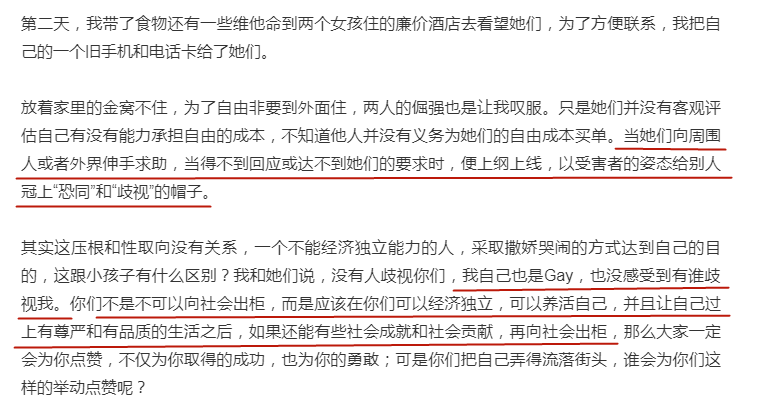 吴卓林和Andi还喜欢给吴绮莉扣歧视同性恋的帽子,为了澄清这个说法,经纪人还自曝了自己喜欢男的性取向反驳,并告诫她们不是不能出柜,而是经济独立,对社会有贡献和价值后再公开。