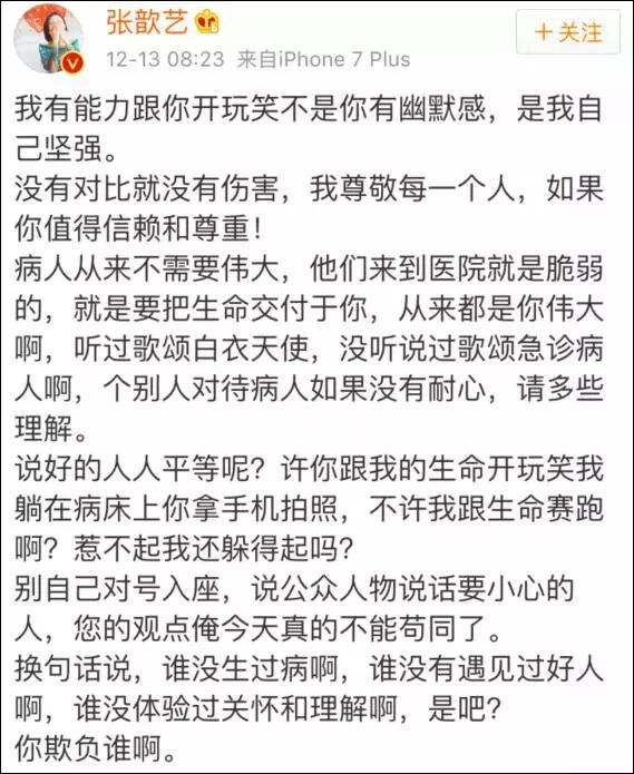 在文中,张歆艺还表示,在医院就诊时会遇到医生拿手机拍照的情况,对此她也觉得很不应该。“许你跟我的生命开玩笑我躺在病床上你拿手机拍照,不许我跟生命赛跑啊?”
