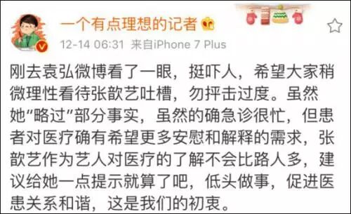 不少网友都站在张歆艺这一边,认为将此事抬到公众人物与医患关系上,有些上纲上线之嫌,“这要是普通人估计都没人理会,也只能当个笑话听~”“就因为张歆艺是公众人物所以把事情夸大了!”