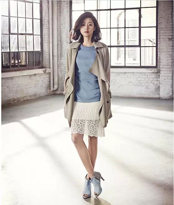 大翻领设计的风衣外套,经典不败的色系,韩范儿十足的风格,穿在身上温柔清新。内搭浅蓝色打底衫,下穿白色镂空蕾丝裙,搭配鱼嘴高跟短靴,散发着优雅女神气息。