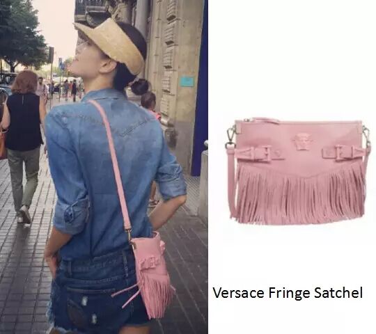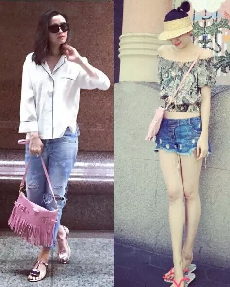 流行色的粉色流苏包包,少女心爆棚,一件一字肩上衣搭配牛仔短裤,再来一个粉色的包包,再合适不过了~