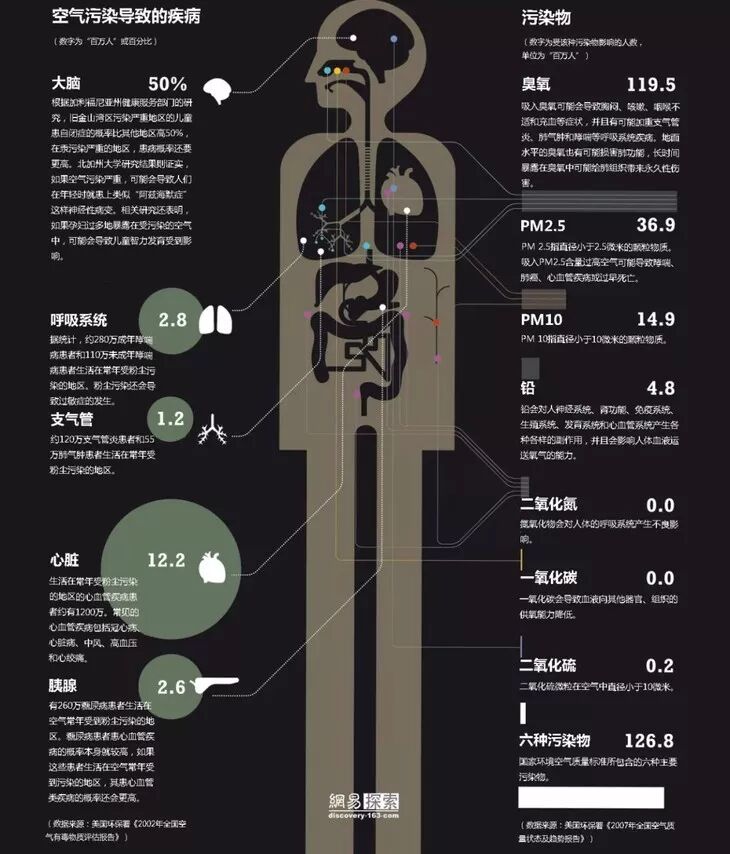 还有生活中的汽车尾气、二手烟、雾霾这些大气污染无不威胁着人们的身体健康,在中国,60%的肺癌患者都跟大气污染有关。
