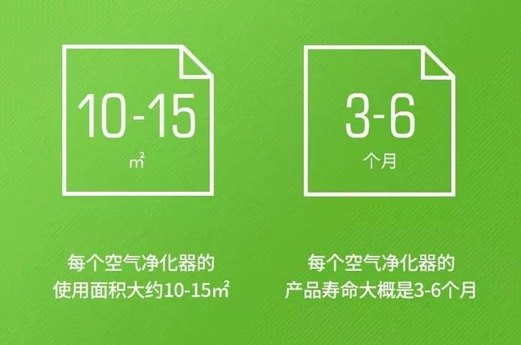 每个空气净化器的使用面积大约10-15㎡,大面积区域建议多个使用。