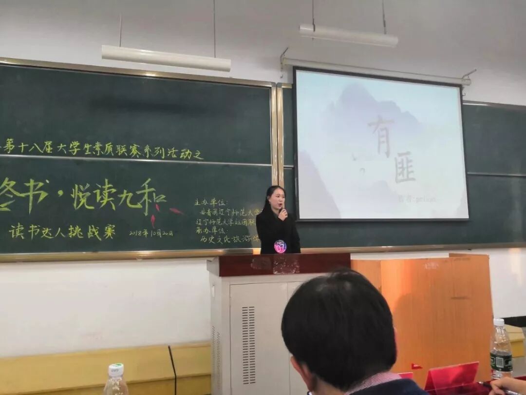 辽宁师范大学第十八届大学生素质联赛系列活动之“秋礼冬书·悦读九和”读书达人挑战赛于10月20日下午3:00在西山湖校区一教406顺利举行。我院选手2017级地理信息科学专业张蕊同学代表学院闯入决赛,并最终获得本届读书达人挑战赛三等奖!