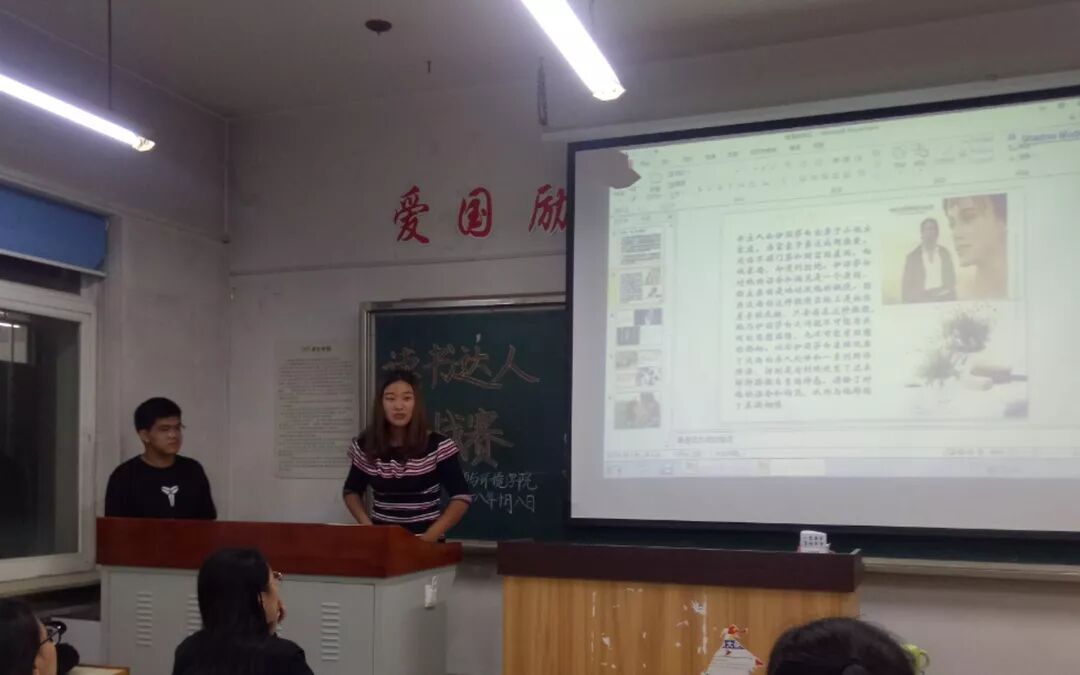 2018年10月8日,我院举办了辽宁师范大学第十八届大学生素质联赛系列活动之“秋礼冬书·悦读九和”读书达人挑战赛初赛,即院内海选赛,由我院社联主席兼学生会副主席李鑫茹、地理协会团长刘美含、副团长杜林娜担任评委。在经过了知识问答以及书籍分享环节后,2017级张蕊同学和2018级何欣潼同学脱颖而出,将代表学院参加读书达人挑战赛复赛。