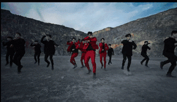 全员穿着红西装的刀群舞也是克里斯马满分。