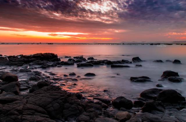 墨色的黑礁石蜿蜿蜒蜒爬满整个海滩,