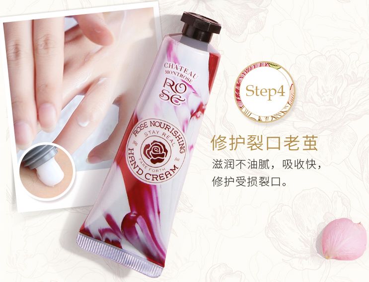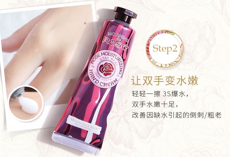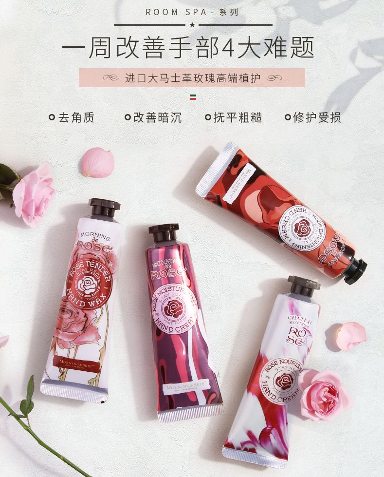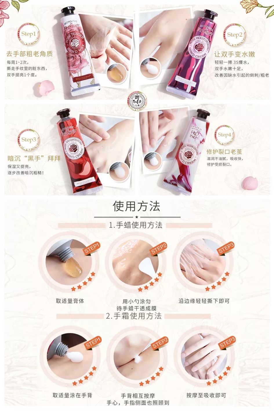 Step2:用手腊进行深层清洁后,睡前涂上厚厚一层玫瑰滋养嫩手霜,让手部一整夜得到修护滋养。