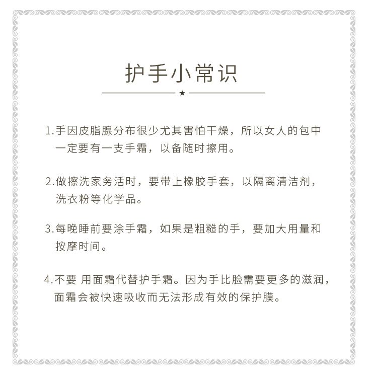 手部整套SPA可一周1~2次,平时护手,选择任意1支手霜都行。洗手后、干燥时、风吹过,都可以用玫莉蔻护手霜即时滋润一下。