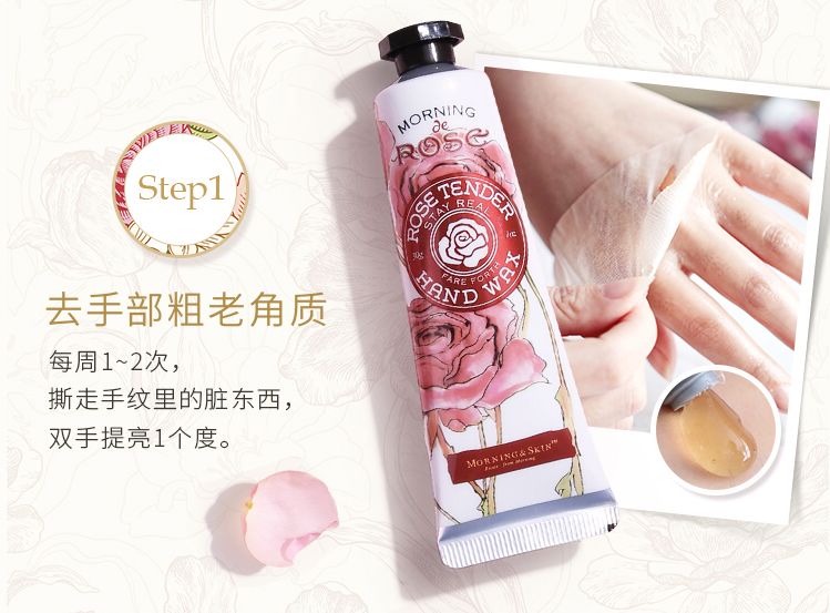 这款玫瑰嫩肤手腊中含有玫瑰精油和新鲜的玫瑰花瓣,可以渗透手部肌肤,软化死皮,深层清洁,去除角质。