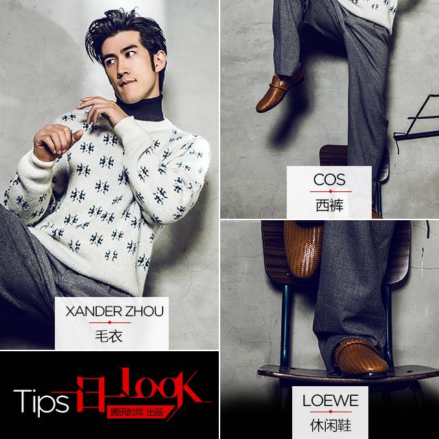 造型解析:白色图案毛衣/ Xander Zhou;灰色休闲裤/ COS;棕色休闲鞋/ LOEWE;黑色高领衫/ 编辑私物
