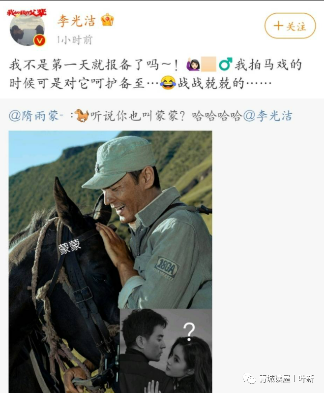 李光洁剧中的马与老婆同名 这波求生欲好强 青城读屋丨叶新 内地男星 2021-10-06 16:18:57 739 创作不易,用心坚持,欢迎请BaGua喝几杯爱心咖啡!打赏并支持本文 打赏并删除本文 李光洁剧中的马和老婆撞名儿了,怕老婆误会还报备了,这波求生欲好强。隋雨蒙- 晒《我和我的父辈》剧照并说这马儿跟我同名。李光洁随后转发,打趣到:“拍戏第一天就回来报备了这个事,拍马戏的时候对马儿呵护备至还战战兢兢” 两口子真的是太可爱了。李光洁与老婆合照。李光洁憨憨的比剪刀手。一家三口幸福合照。 创作不易,用心坚持,欢迎请BaGua喝几杯爱心咖啡!打赏并支持本文 打赏并删除本文 感谢您的支持鼓励,我会继续努力的!文章地址:用户邮箱:打赏金额:USDT 请输入数字点击”去打赏“,即可进行打赏支持本文章哦 李光洁 About the Author 青城读屋丨叶新 功能介绍: Related Posts 李光洁剧中的马与老婆同名 这波求生欲好强 2021-10-06 16:18:57 发表评论