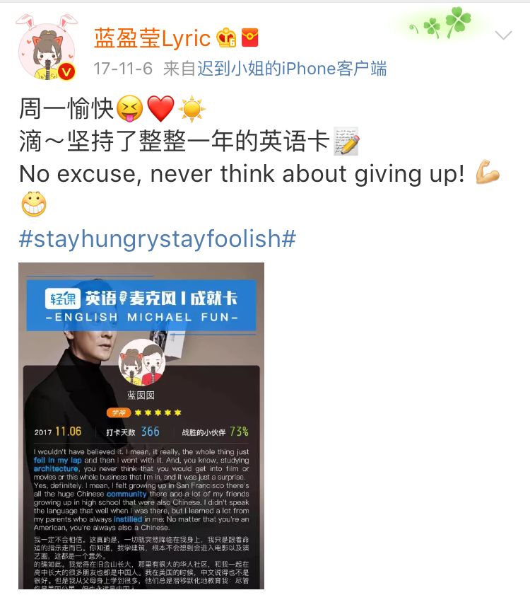 A:因为我想要驯服自己,懒癌发作的时候,和自己做斗争。越是了解自我,就越知道什么招儿能制得住我,制定新年计划,可以让我更有心力去执行。公布于众以后,粉丝也会督促你,我的英语打卡每天放到粉丝群,他们可以看到我是不是写阅读笔记了,是不是弹唱了,有人督促你挺好的。