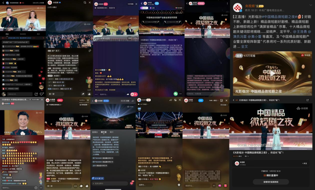 直播当晚,全网各平台直播观看量超600万次。总台新媒体矩阵联合超50家地方融媒体官方新媒体账号同步直播,覆盖央视频、微博、微信视频号、抖音、快手、头条、百度、腾讯、优酷等超12个平台及网站,获近20项重点资源位推荐。截至11月4日,#中国精品微短剧之夜#等活动相关话题全网阅读量、播放量累计超8000万次。获新华网、光明日报、学习强国客户端、光明网、人民政协网等超30家主流媒体、超80家地方媒体持续跟踪报道。