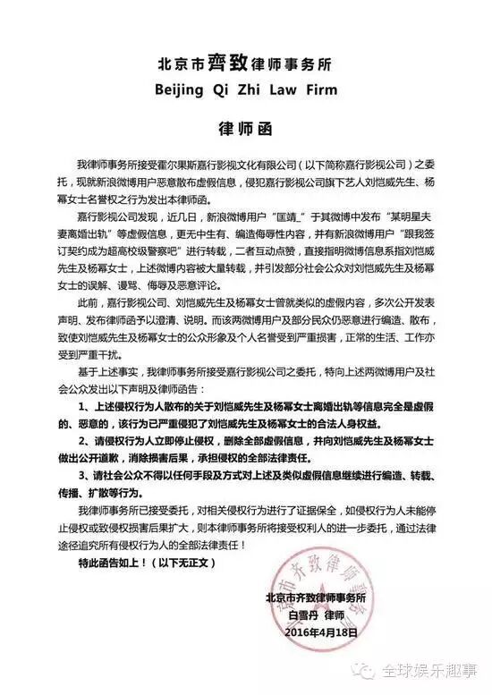 4月18日,嘉行影视公司在微博上公开发布律师函,对近日网络上流传的公司旗下艺人刘恺威杨幂夫妇恶意不实传言(“某明星夫妇离婚出轨”)做出严正声明,表示将向造谣者追究法律责任。