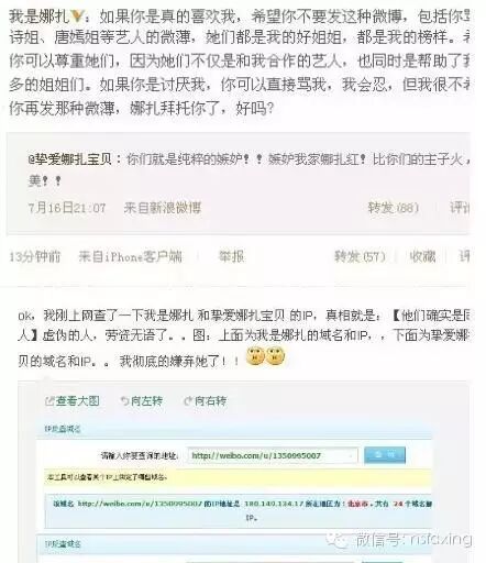 3、注册小号恶意的攻击其它女艺人,结果被扒皮是同一IP,还假装大度帮人说话