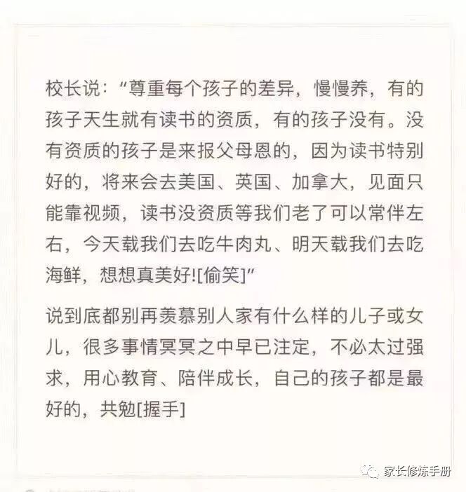 第一句:尊重每个孩子的差异,慢慢养,有的孩子天生就有读书的资质,有的孩子没有。这是一句正确的废话。但是非常重要的一个问题校长没有说:到底如何判断自己的孩子有没有读书的资质?