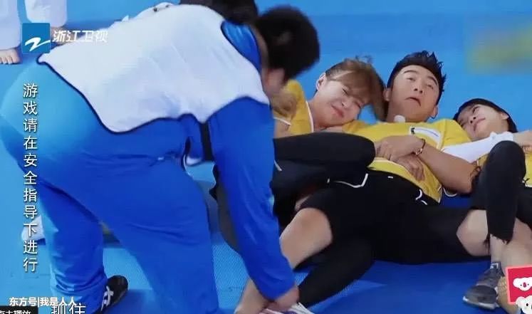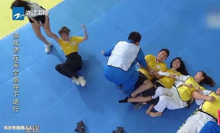 游戏一开始,各种激烈对抗啊!李佳航和体育生动作迅猛有力,瞄准了孙艺洲这个最大突破点,死命的生拉硬拽最后快速成功,孙艺洲被拉出蓝色区域外。