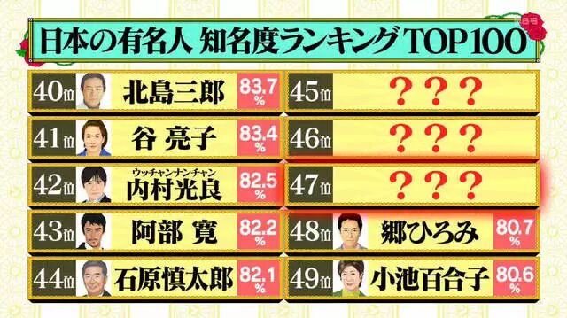 我们唱看到日本媒体做的知名度和人气的调查排名,但通常都只限电视曝光率高的艺人们,这一次综艺节目《水曜日のダウンタウン》为了验证“铃木一郎是否是日本最有名的人”,推出“神企划”——100位日本最有知名度的公众人物。