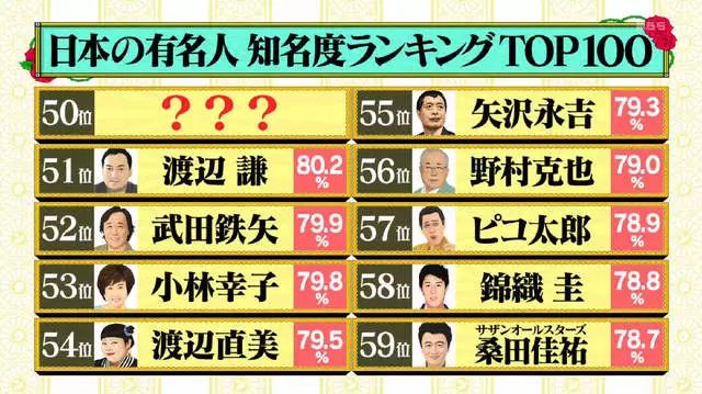 第59到50名中一眼看到去年因《PPAP》瞬间爆红的PICO太郎,第57会不会太高了,歌王桑田佳佑在他之后,歌手上榜的还有举办过接近2000场演唱会的摇滚音乐人矢泽永吉和演歌天后小林幸子。熟悉的面孔还有高好感度搞笑艺人渡边直美、“国民老师”武田铁矢、日本影帝渡边谦。
