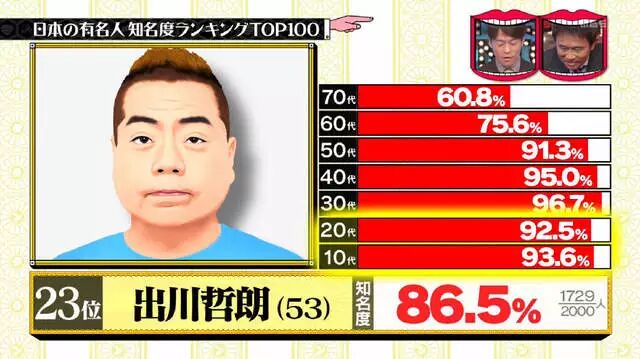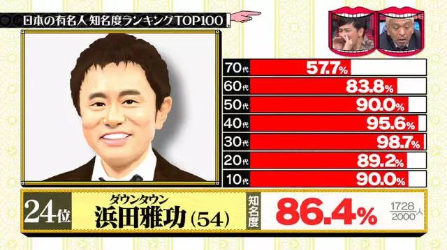 出川哲朗和滨田雅功两位大家很熟悉的搞笑艺人排名也非常高,分别是第23和第24.