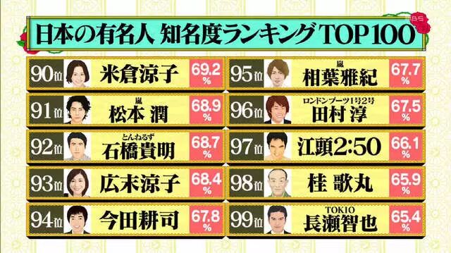 100名到90名中,我们看到的艺人有杰尼斯的长濑智也、相叶雅纪、松本润,搞笑艺人江头2:50、今田耕司、石桥贵明,还有女演员广末凉子和米仓凉子。