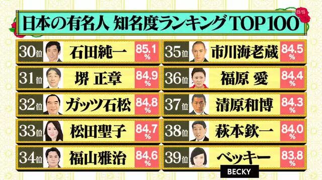 第39到第30名,最瞩目的是第39名的becky,原先就是常出现在日本综艺上的嘉宾,去年不伦事件后,更是家喻户晓了。在中国播放过的《超级变变变》的主持人萩本钦一排名第38,这档节目至今仍然在日本播放中,另一位老资历主持堺正章排第31。歌舞伎在日本有很高的地位,歌舞伎演员市川海老藏排名第35,越来越有魅力的国民男神福山雅治第34,80年代王道偶像松田圣子排名第33。乒乓球选手福原爱排第36,看来爱酱不仅仅是中国观众最喜欢的日本运动员,在日本也有极高的知名度。